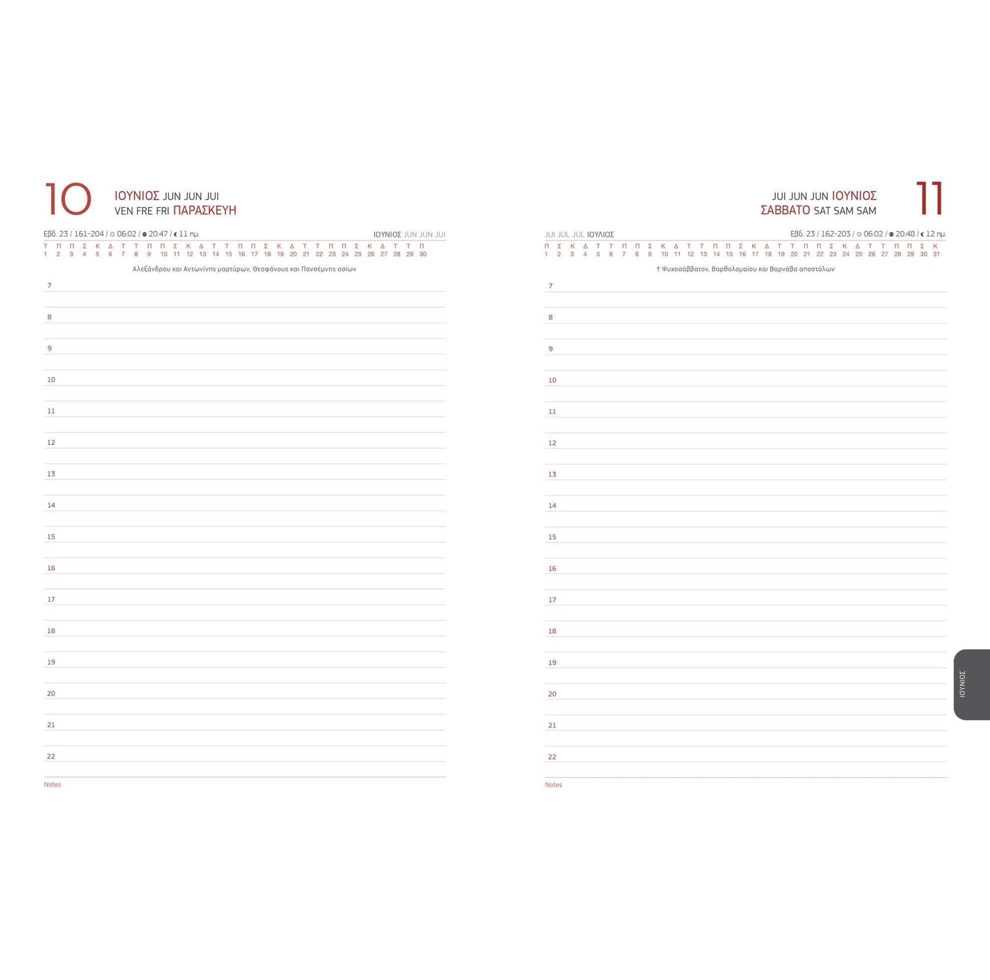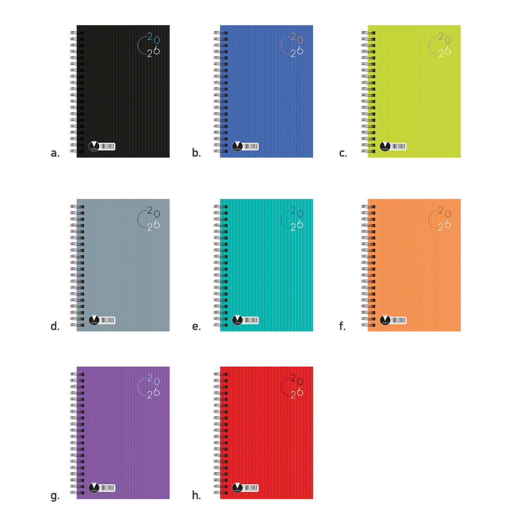Ημερήσιο ημερολόγιο σπιράλ με τετράχρωμη εκτύπωση στο κάλυμμα και με Glossy πλαστικοποίηση. Δίχρωμη εκτύπωση στο εσωτερικό σε χαρτί 70 γρ. Σάββατο και Κυριακή σε δύο σελίδες. Συνοπτικά ημερολόγια και πλάνα. Ανατολή - Δύση, Φάσεις Σελήνης. Παγκόσμιες ημέρες, εορτολόγιο, επίσημες αργίες. Χρήσιμες πληροφορίες, τηλεφωνικό ευρετήριο. Διατίθεται σε 3 μεγέθη 12Χ17εκ, 14Χ21εκ και 17Χ24 εκ. Διαθέσιμο σε 8 χρώματα**Η δυνατότητα επιλογής χρώματος εξαρτάται από την διαθεσιμότητα του είδους κατά την χρονική στιγμή της παραγγελίας.